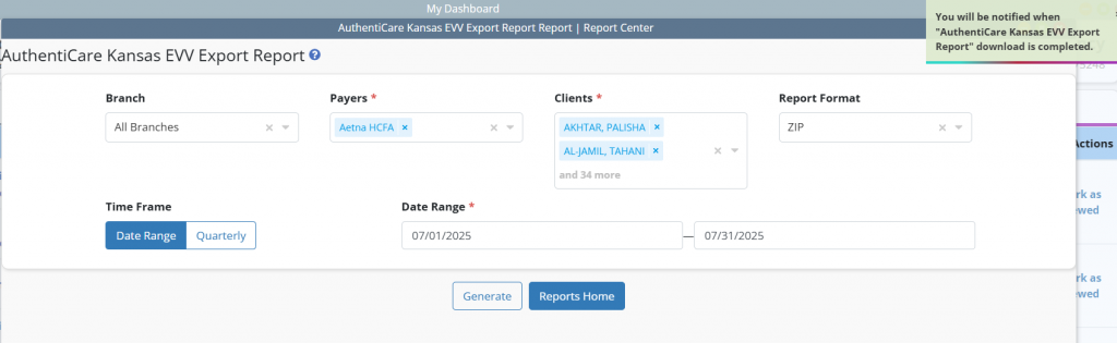 Axxess Home Care now enables users in Kansas to download and upload captured EVV data to the AuthentiCare portal using the AuthentiCare EVV Kansas Export Report, ensuring accurate EVV reporting and compliance.