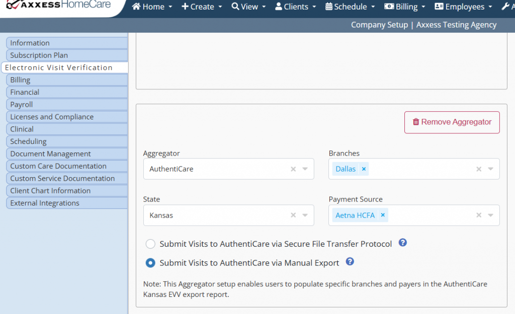 2. Select AuthentiCare from the Aggregator drop-down menu. Select Kansas from the State drop-down, then select the applicable branches and payment sources.