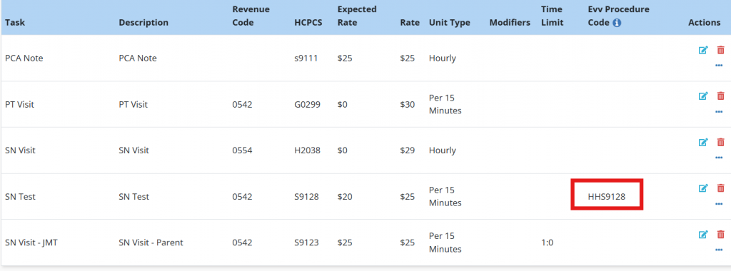 On the UB-04 tab, navigate to the Bill Rates tab and click the edit icon under the Actions column to enter the appropriate EVV procedure code. The code must match the required service IDs accepted by AuthentiCare for the state of Kansas.