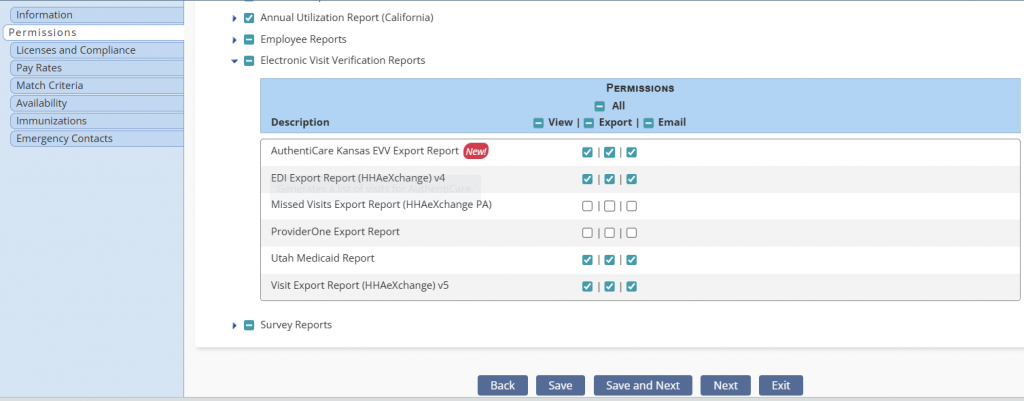 Employees tab ➜ Employee Center ➜ Quick Links menu ➜ Permissions ➜ Reports ➜ Electronic Visit Verification Reports ➜ AuthentiCare Kansas EVV Export Report ➜ Save