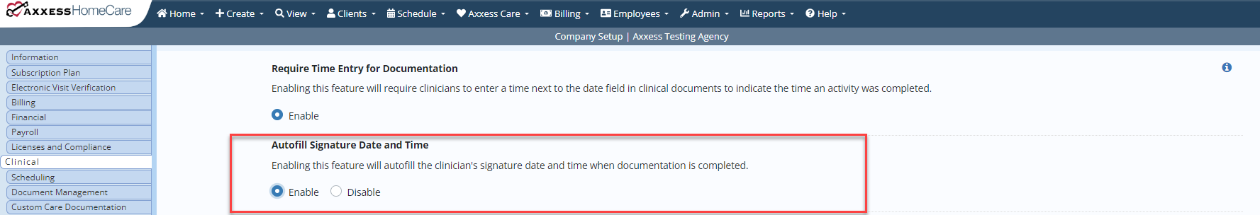 To enable autofill signature date and time, navigate to Company Setup under the Admin tab. On the Clinical tab, click Enable under Autofill Signature Date and Time and select Save.