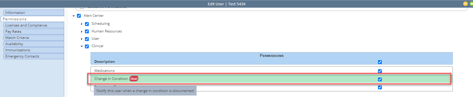 To give a user permission to document a change in condition, navigate to the user’s profile in the Employee Center and select Permissions from the Quick Links menu. Expand the Clinical section and select the desired permissions under Change in Condition.