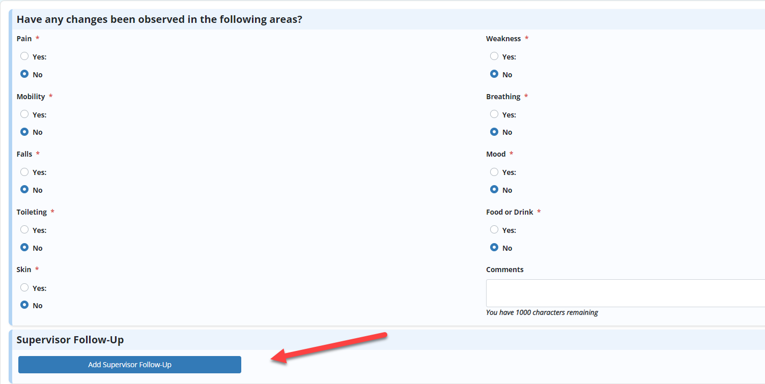 The Supervisor Follow-Up permission will enable the user to document a supervisor follow-up after a change in condition addendum is completed. Both the original caregiver’s signature and supervisor’s signature will be captured on the addendum.