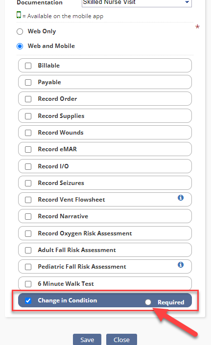 On the Edit Custom Note or New Custom Note screen, check the box next to Change in Condition to add the addendum to the task. To require users to complete this addendum when completing the task, select the bubble next to Required. If this option is selected, users will not be able to complete the task without completing the change in condition addendum. Click Save to finish adding the addendum to the task.