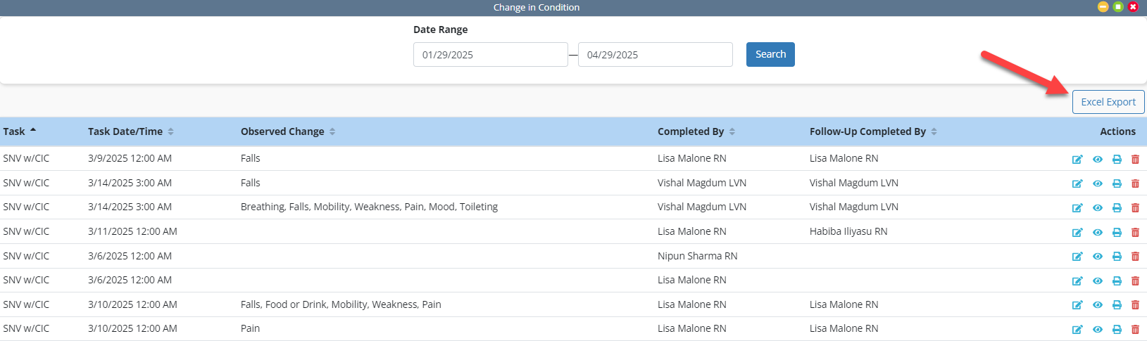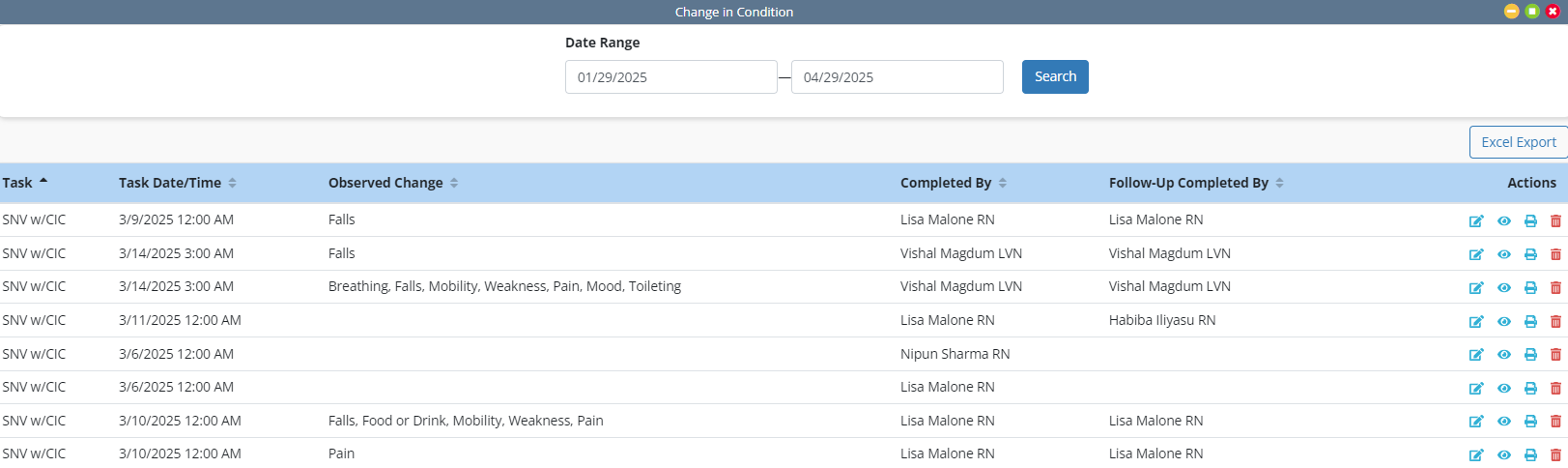The Change in Condition Quick Report displays the task to which the change in condition addendum was associated, the date and time the task was completed, the observed change, the user who completed the addendum, the user who completed the Supervisor Follow-Up section, and the Actions column with icons to edit, view, print, or delete the change in condition addendum.