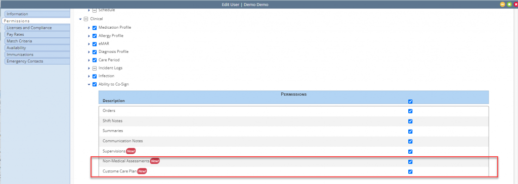 Employees tab ➜ Employee Center ➜ Quick Links menu ➜ Permissions ➜ Clinical ➜ Ability to Co-Sign ➜ Non-Medical Assessments ➜ Custom Care Plan ➜ Save