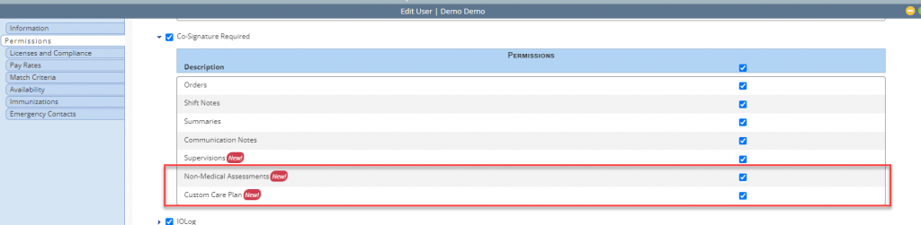Employees tab ➜ Employee Center ➜ Quick Links menu ➜ Permissions ➜ Clinical ➜ Co-Signature ➜ Non-Medical Assessments ➜ Custom Care Plan ➜ Save