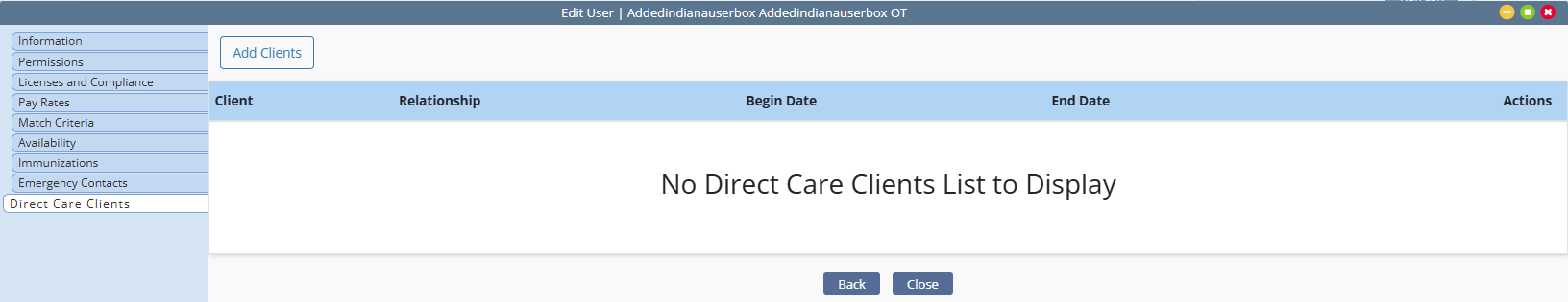 Next navigate to the profile of the employee you want to designate as a live-in caregiver. In the user’s profile, navigate to the Direct Care Clients tab and click Add Clients.