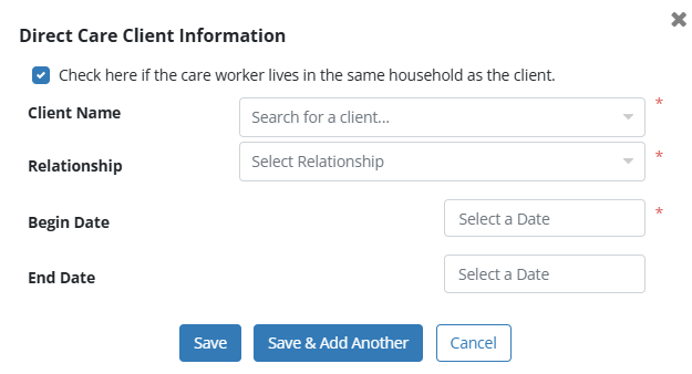 In the Direct Care Client Information window, check the box next to Check here if the care worker lives in the same household as the client and complete the remaining fields.