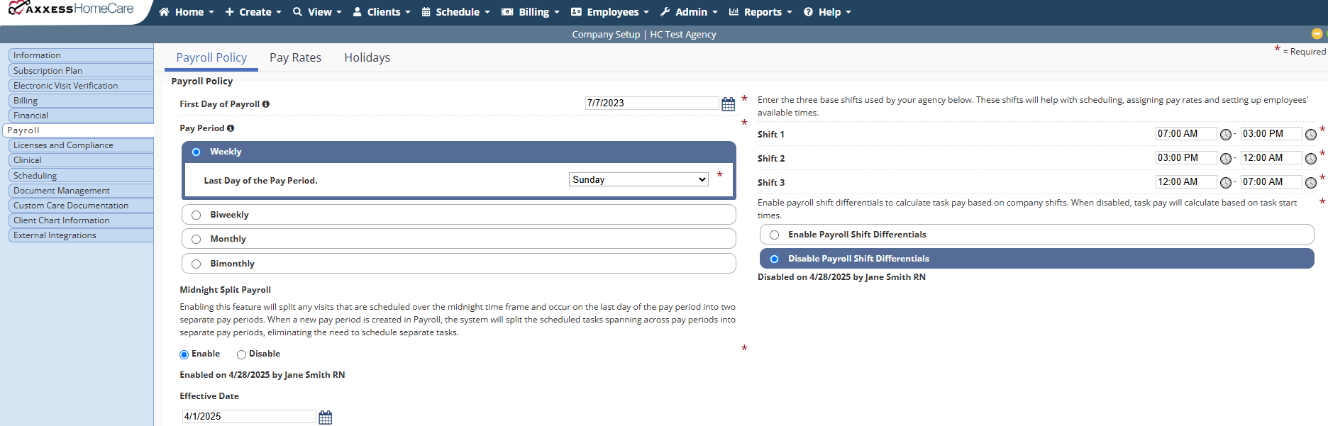 Axxess Home Care now provides a Midnight Split Payroll section in Company Setup that enables users to split tasks that are scheduled across pay periods into two separate payroll records. This enhancement streamlines operations by eliminating manual steps in the payroll process and decreases costs by minimizing user workload.