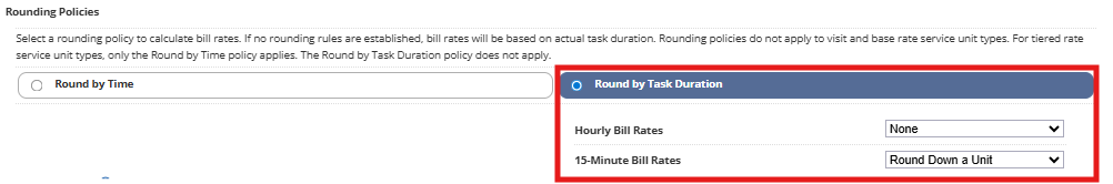 To ensure accurate calculations, payers integrated with Sandata Missouri must use Round Task by Duration and Round Down a Unit.