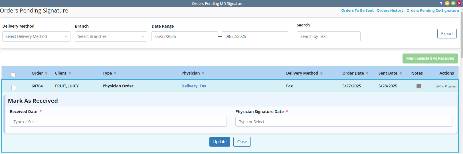 Enter the date the order was signed and the date the order was received, and click Update.