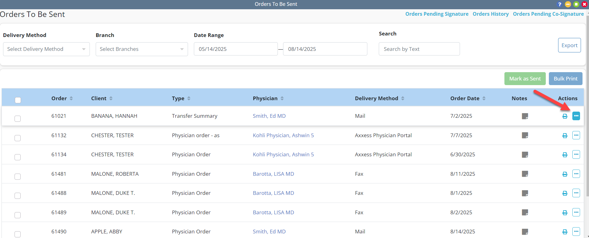 Once an order is completed and in the Orders To Be Sent list, select the new ellipsis icon under Actions next to the order you wish to send.