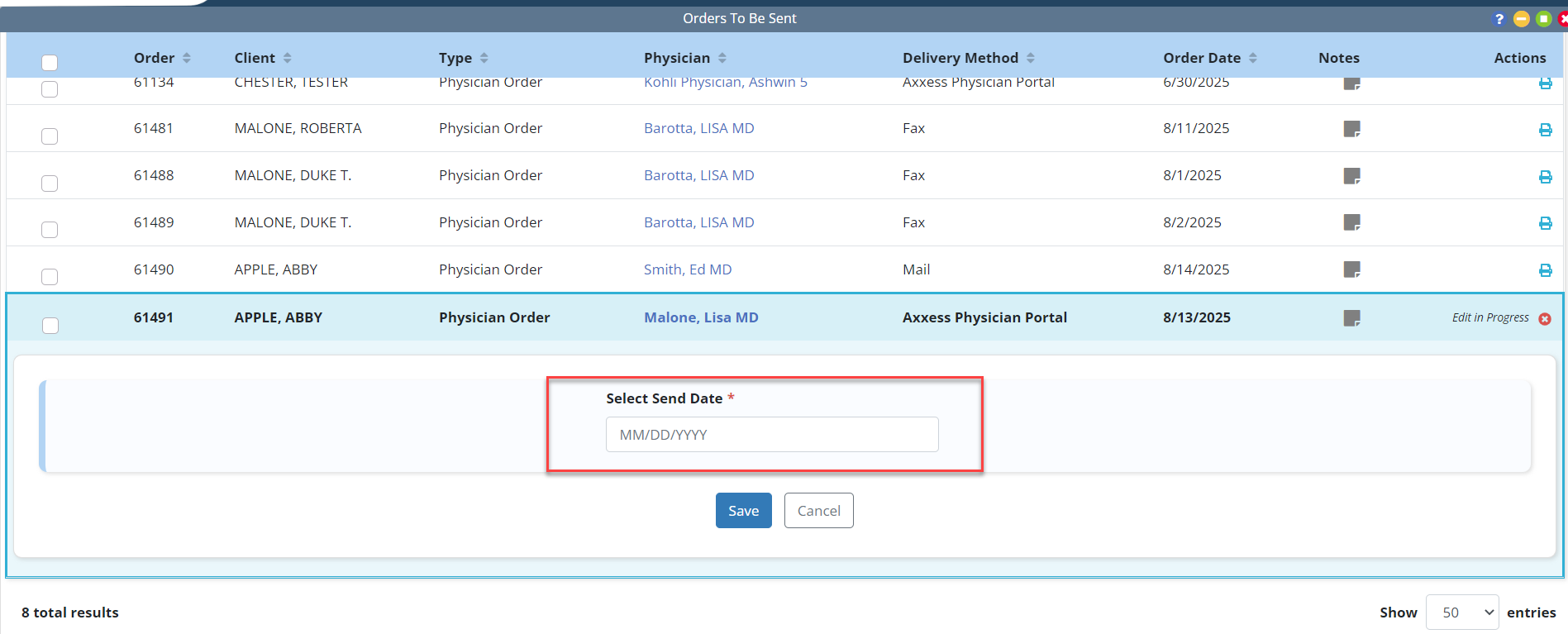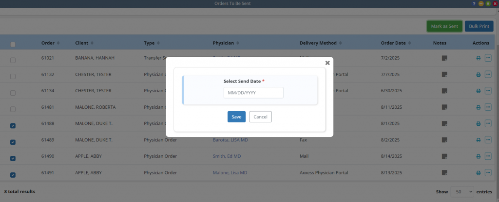 Once Mark as Sent is selected, the Select Send Date window will appear. Enter or select a date and click Save. Each of the selected orders will be marked as sent and moved to the Orders Pending Signature screen with the selected send date.