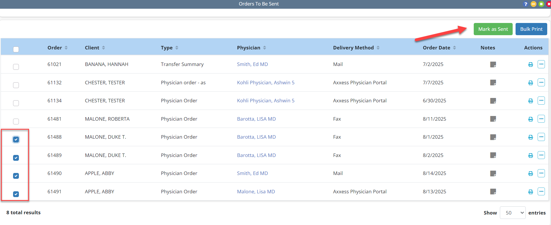 To mark multiple orders with the same send date, select the checkboxes next to the desired orders and click Mark as Sent in the top-right corner of the screen.