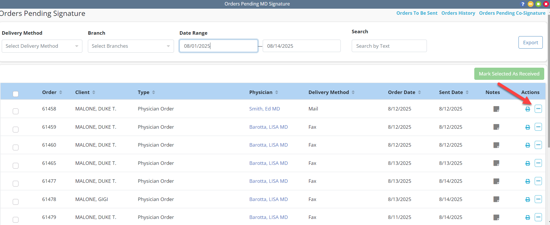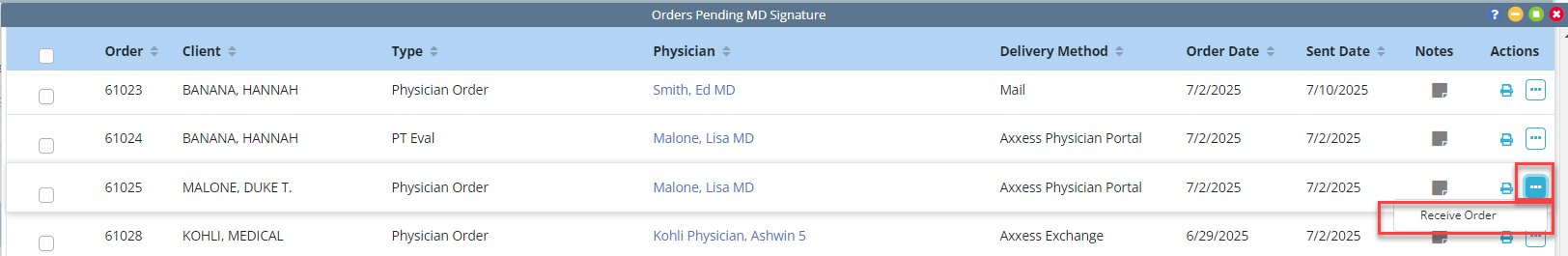 The Receive Order button in the Actions column on the Orders Pending Signature screen has also been replaced with an ellipsis icon, but all other functionality remains the same.