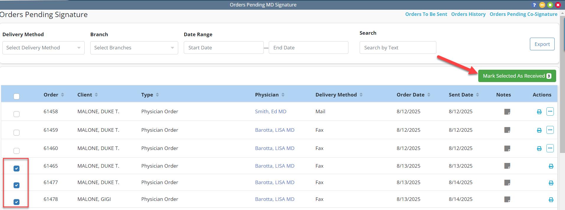 To mark multiple orders as received, select the checkboxes next to the desired orders and click Mark Selected as Received in the top-right corner of the screen.