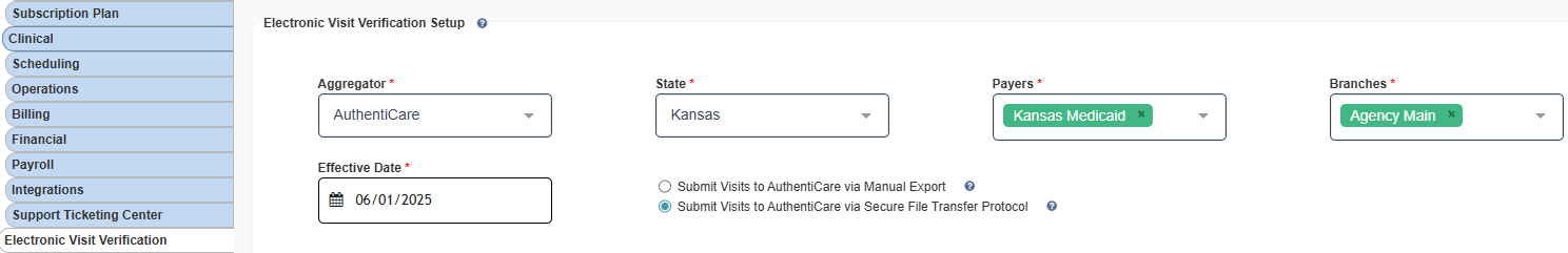 Admin tab ➜ Company Setup ➜ Electronic Visit Verification tab ➜ Aggregator field: AuthentiCare ➜ State field: Kansas