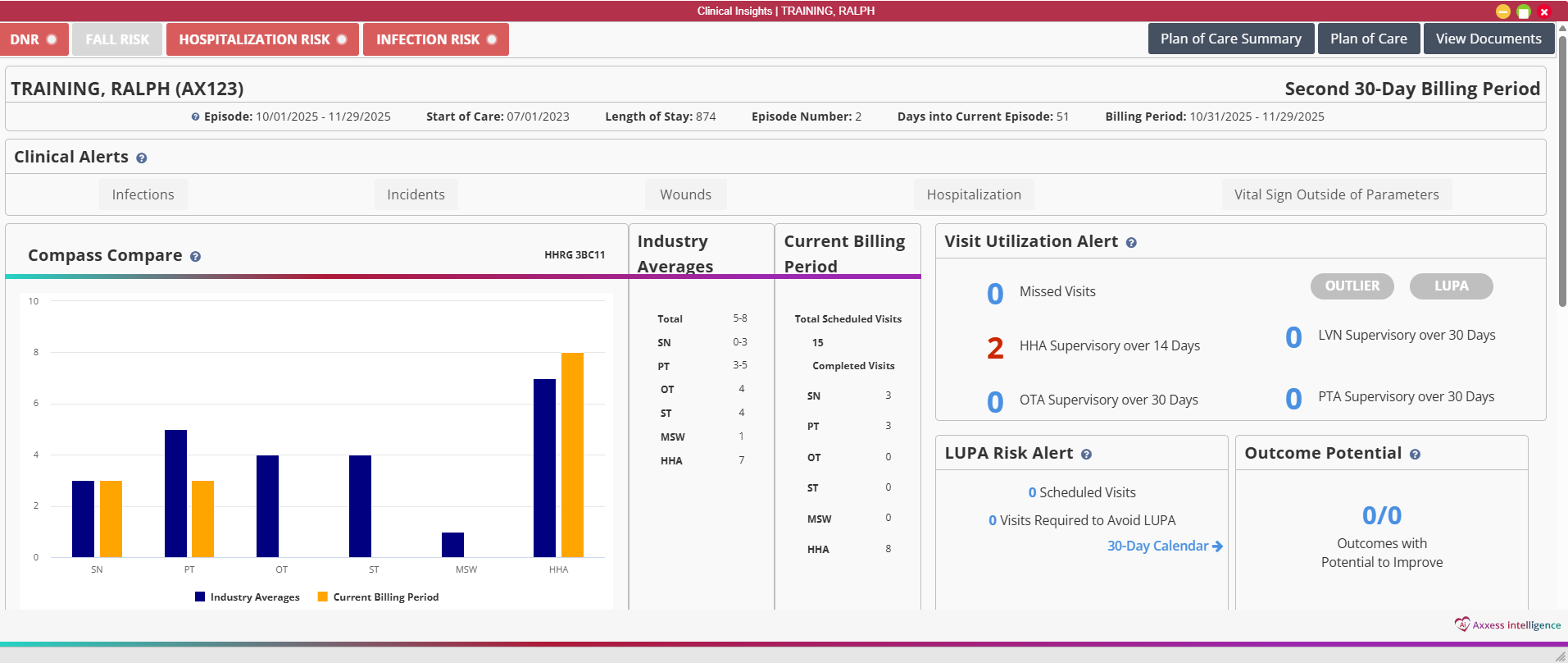 Axxess Home Health now provides a Clinical Insights tab in each patient’s chart for Axxess intelligence™ Premium users. The new Clinical Insights tab displays all data that appeared in the previous PDGM tab plus a new Compass Compare tool, enabling organizations to compare service utilization for a patient’s current billing period to national standard visit levels reported by SimiTree.