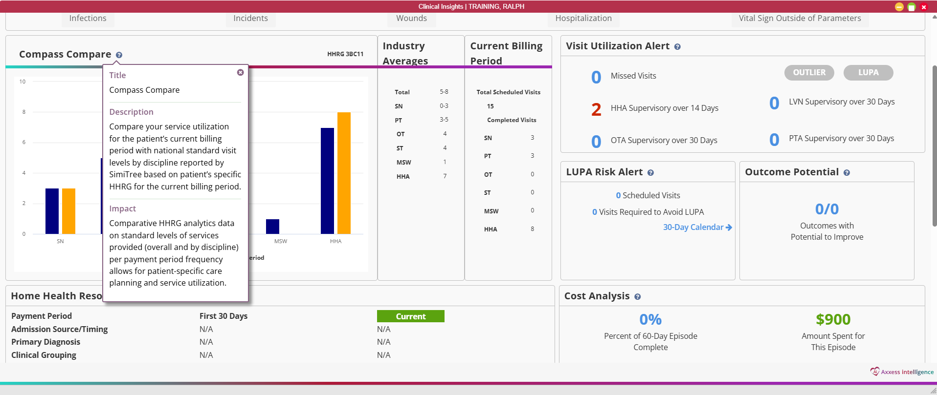The Compass Compare widget on this tab displays the patient’s visits per discipline for the current billing period compared to national standards from SimiTree based on the patient’s HHRG.