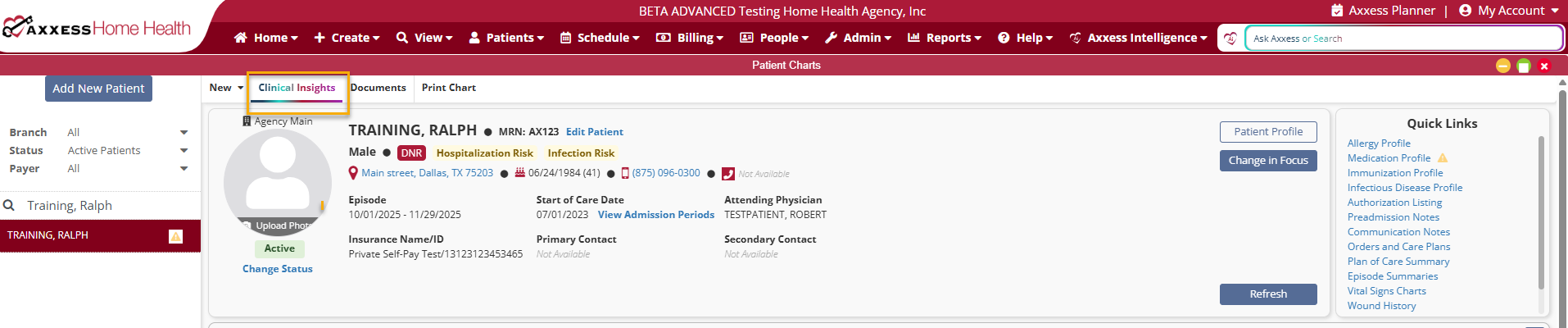 Note: The Clinical Insights tab is only available in the patient’s chart if the patient has an active billing period with a payer that generates an HHRG.
