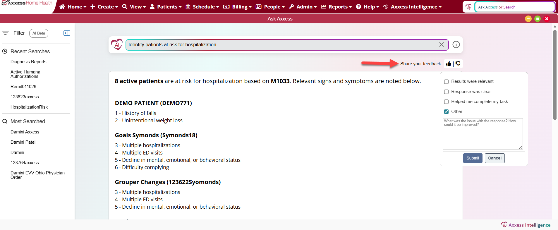 Ask Axxess includes feedback tools that help improve the accuracy and usefulness of your search results. Use the thumbs-up or thumbs-down icons to let us know what worked well and how we can improve.