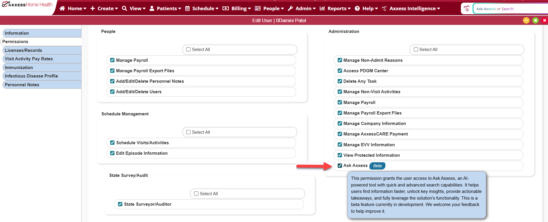 To access Ask Axxess, the Ask Axxess permission must be enabled in Axxess Home Health.