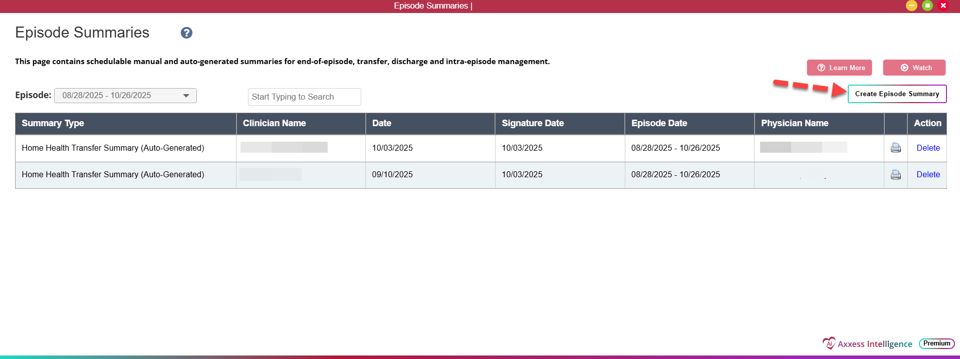 Episode summaries, driven by Axxess intelligence™, are automatically generated in Axxess Home Health, so clinicians do not need to spend time manually collecting and documenting episode information. This functionality enhances ease of use, reduces documentation time, and optimizes organizational efficiency.