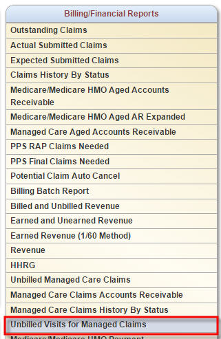 Once in the Report Center, find the Unbilled Visits for Managed Claims report located in the Billing/Financial Reports section.