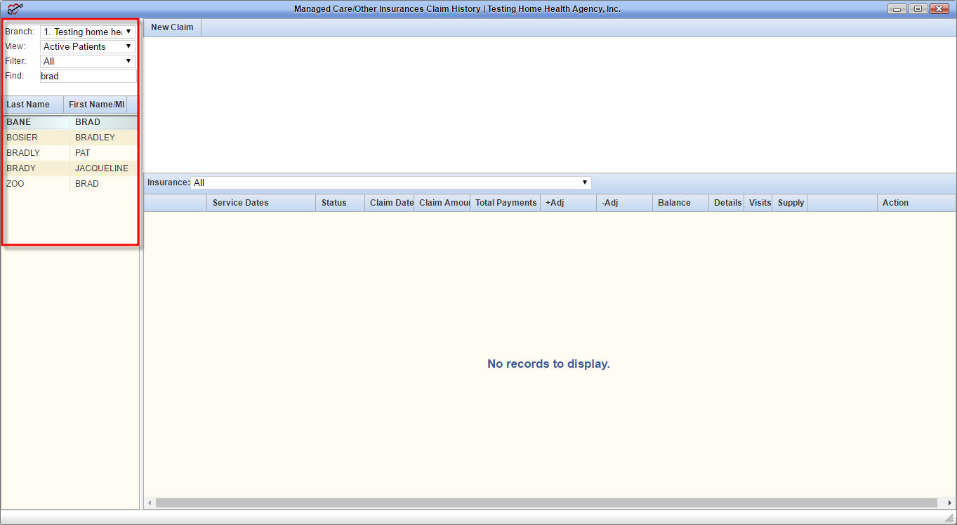 Identify if a claim has already been created for the time-frame of the visits by viewing the lower section of the claims history page. All existing claims for a patient will be listed in this area. In this example, there are no existing claims for the patient.