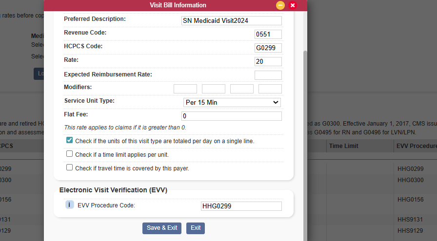 Once this information in Company Setup is saved, navigate to the Admin tab and select Insurances/Payers from the Lists menu. Locate the applicable payment sources and select the edit icon under the Actions column to enter the EVV Procedure Code for each associated task utilizing the AuthentiCare Service Codes and Activity Codes list.
