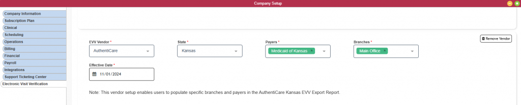 3. Select AuthentiCare from the EVV Vendor drop-down menu. Select Kansas from the State drop-down, then select the applicable payers and branches.