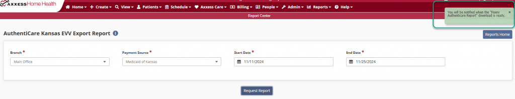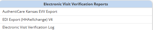 5. Once visits associated with the configured payers have been completed, navigate to the Report Center and select the AuthentiCare Kansas EVV Export report under Electronic Visit Verification Reports.