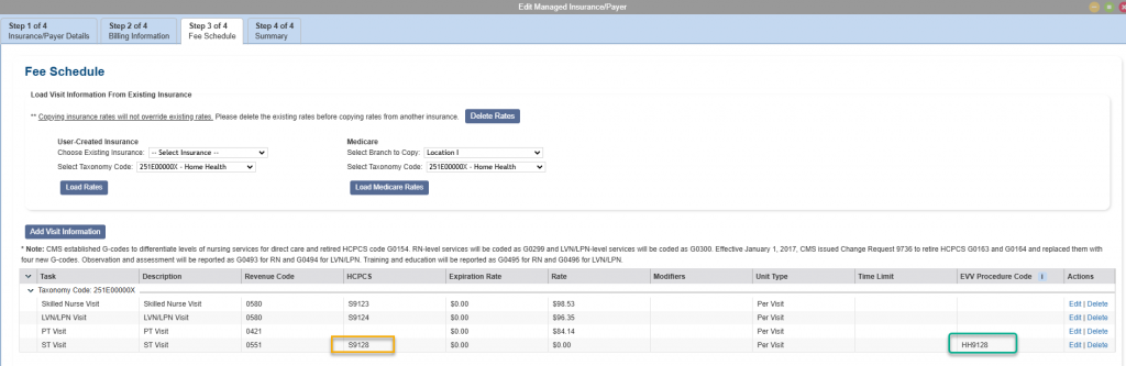 4. Navigate to List under the Admin tab and select Insurance/Payers. Then configure the EVV procedure code to match the required service IDs accepted by AuthentiCare for the state of Kansas.