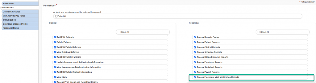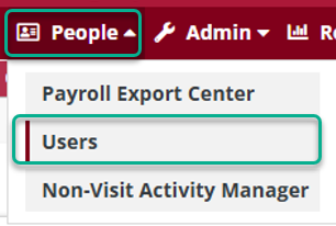 2. Navigate to Users under the People tab and select the desired user. Select the edit icon () and navigate to the Permissions tab. Under the Reporting section, select the box next to Access Electronic Visit Verification Reports.