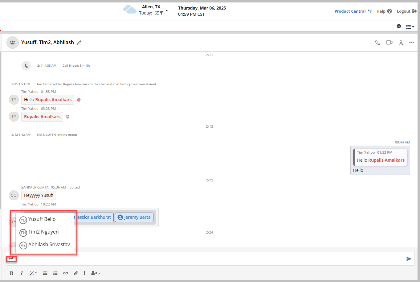 Tag a user to direct a specific message to them in the conversation. Select the @ symbol and a list of users will appear. Select the user you would like to tag.