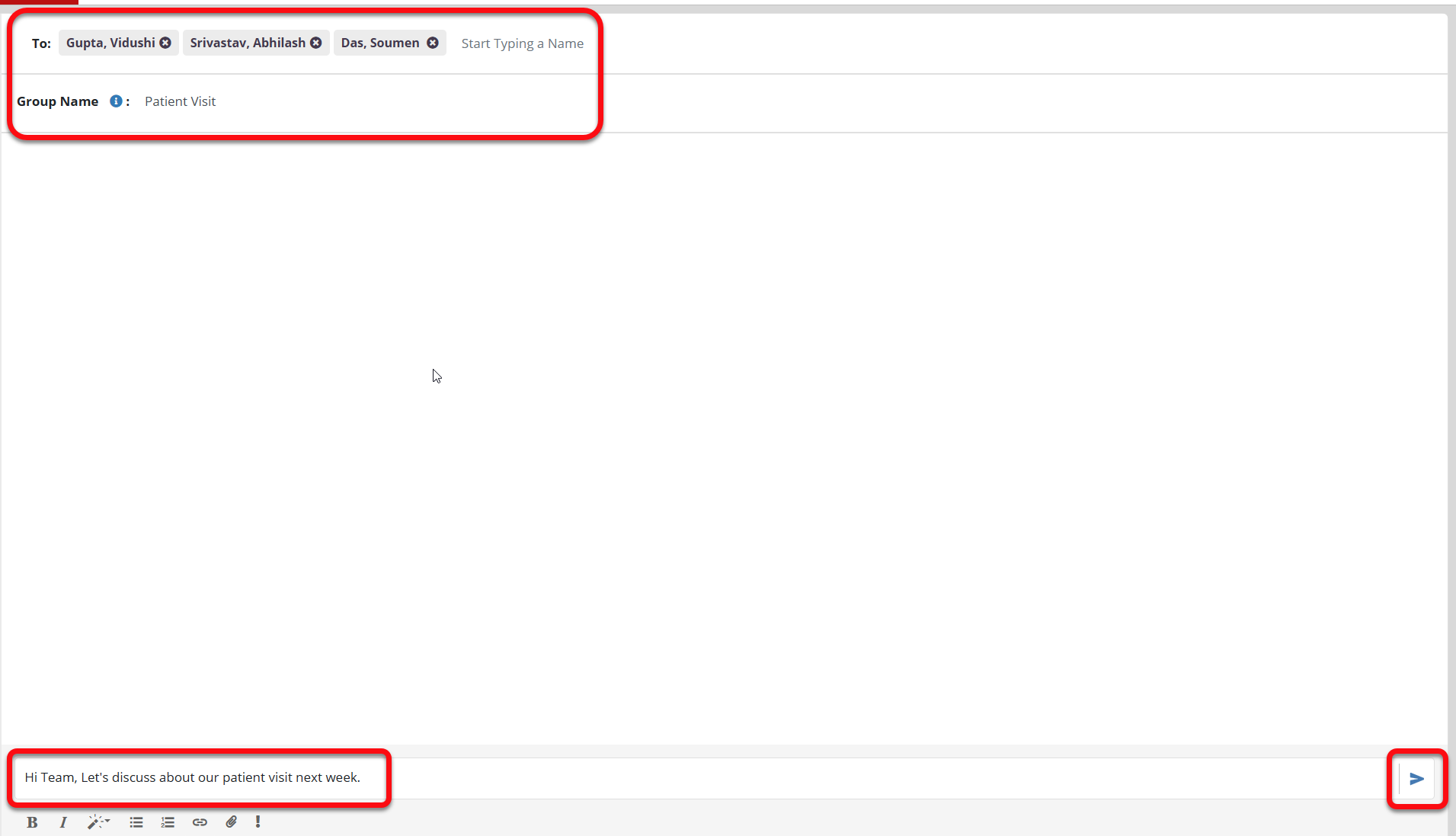A conversation window will appear where you can enter a group name and add users. To add a user, enter and select their name in the To section, type a message and select the send icon.