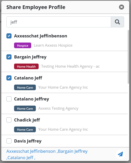 To share an employee or patient profile, enter the name. A list of names will then appear.