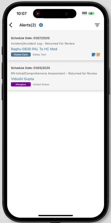 Tap Alerts to view all visits and tasks that have been returned by quality assurance (QA).
