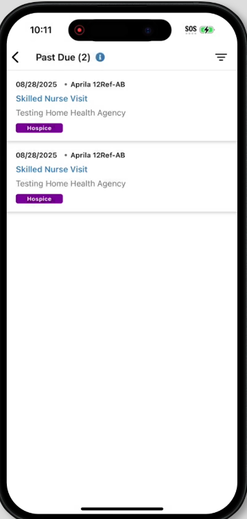 Tap Past Due to view a list of visits from the past 21 days that haven’t been signed and completed.