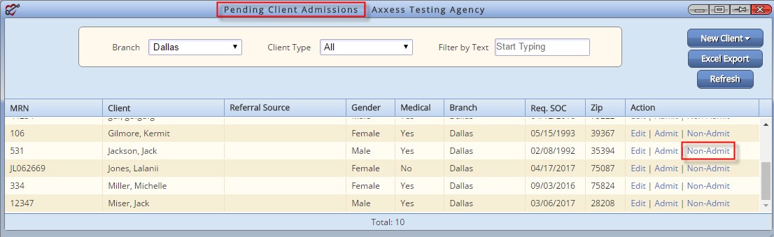 The first place to make a client a non-admit is while the client is still in either Referral or Pending Admission status: