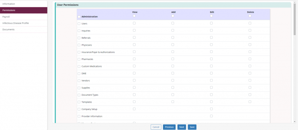 On the Permissions tab, check the boxes to set the user’s permissions. Check the boxes next to the headers to select all permissions in a section. When done, click Next.