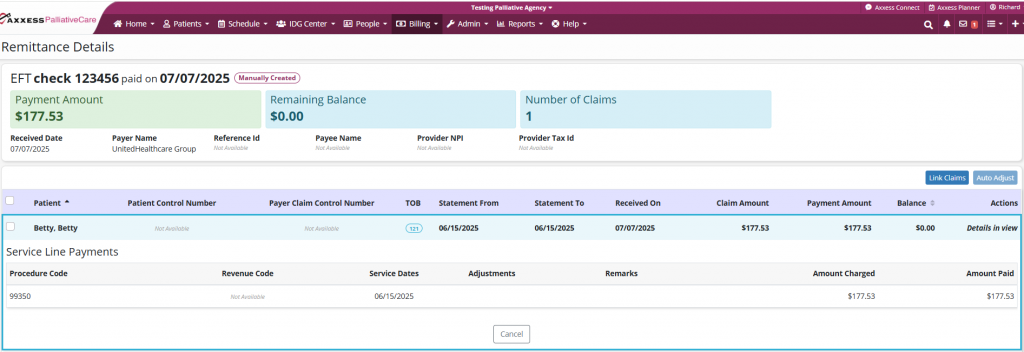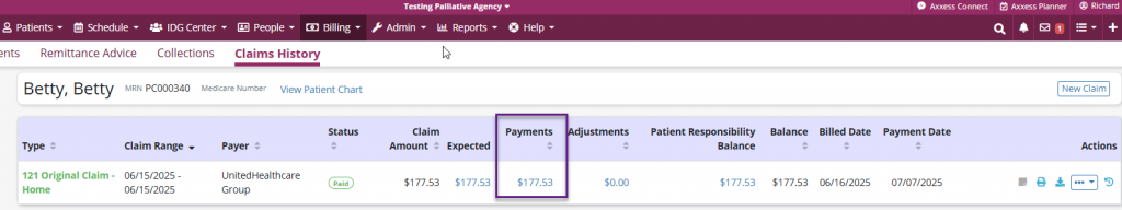 Axxess Palliative Care now enables users to access claim remittance details directly from the Claims History screen. By enabling users to conveniently navigate to a remittance from Claims History, this enhancement streamlines operations and promotes ease of use.
