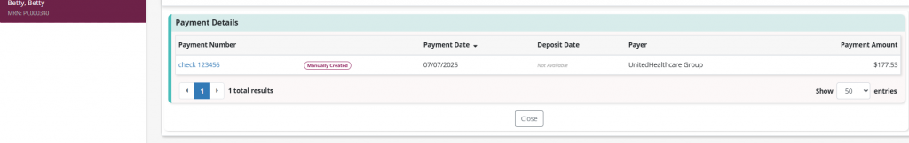 When clicked, the payment details will populate. The included columns display the Payment Number, the type of remit (manually created or auto generated), Payment Date, Deposit Date, Payer and the Payment Amount of the remittance.