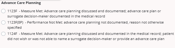 If the organization has advance care planning enabled in the integration, the Advance Care Planning section will appear with the following codes:
