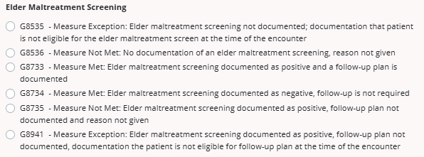 If the organization has elder maltreatment screening enabled in the integration, the Elder Maltreatment Screening section will appear with the following codes: