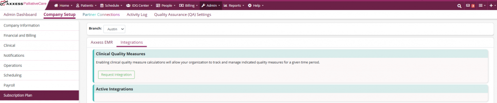 Admin tab ➜ Company Setup ➜ Subscription tab ➜ Clinical Quality Measures section ➜ Request Integration