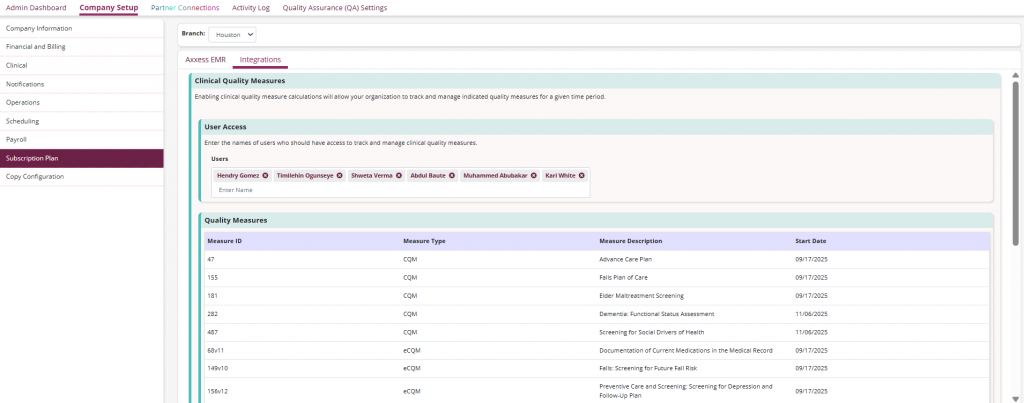 Once the integration is enabled in Company Setup, a User Access field will be accessible. In this field, the names of users tracking and managing clinical quality measures can be entered. A Quality Measures table will also be visible, this table displays the measures that have been enabled for the organization with the following columns: Measure ID, Measure Type, Measure Description and Start Date.
