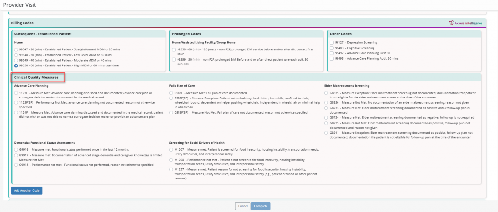 Once the visit is completed, the Clinical Quality Measures section will be displayed under Billing Codes.