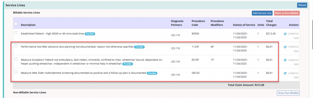 After a user completes a visit and selects the CQM codes, the corresponding CPT II codes will be displayed in the Billable Service Lines section when verifying a HCFA 1500 claim.